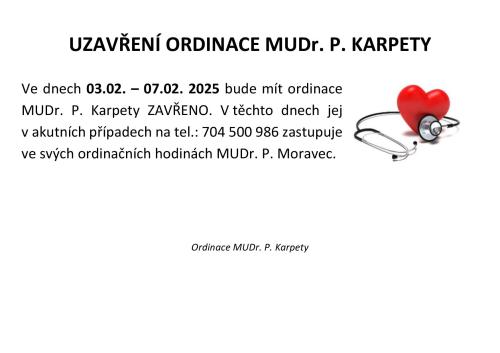 Ordinace MUDr. P. Karpety bude uzavřena od 3. do 7. února 2025. V akutních případech bude MUDr. Karpeta zastoupen MUDr. P. Moravcem, který je dostupný na telefonu 704 500 986 během svých ordinačních hodin.