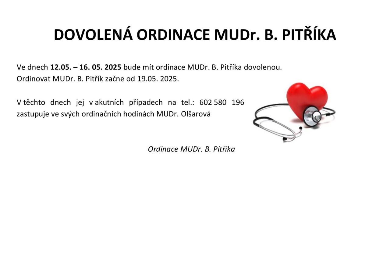 Ordinace MUDr. B. Pitříka bude uzavřena od 12. do 16. května 2025. V případě akutních případů je možné se obrátit na MUDr. Olšarovou, která ordinaci zastupuje.