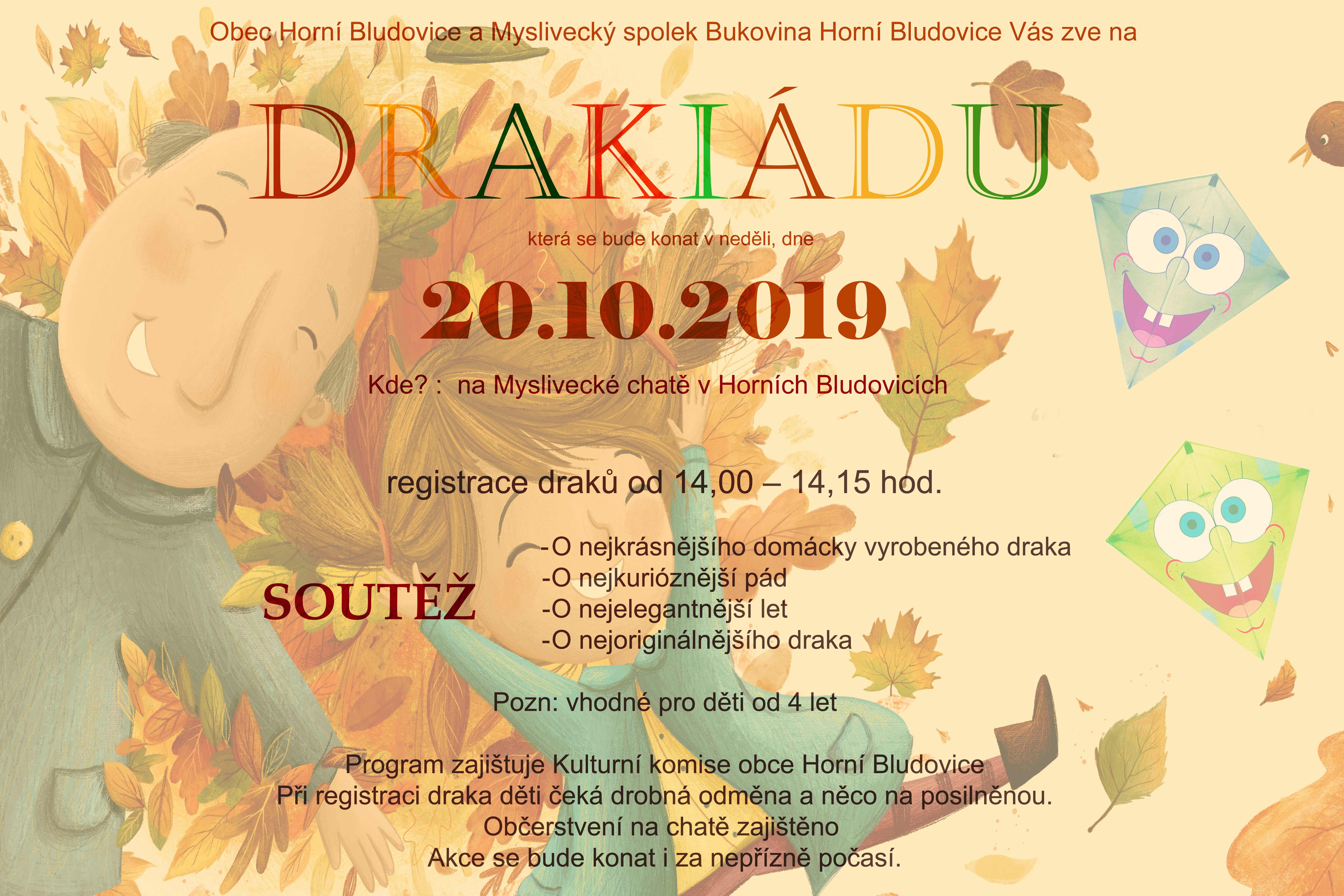 Přijďte na DRAKIÁDU, která se uskuteční v neděli 20. 10. 2019 na Myslivecké chatě v Horních Bludovicích. Registrace draků je od 14:00 do 14:15.