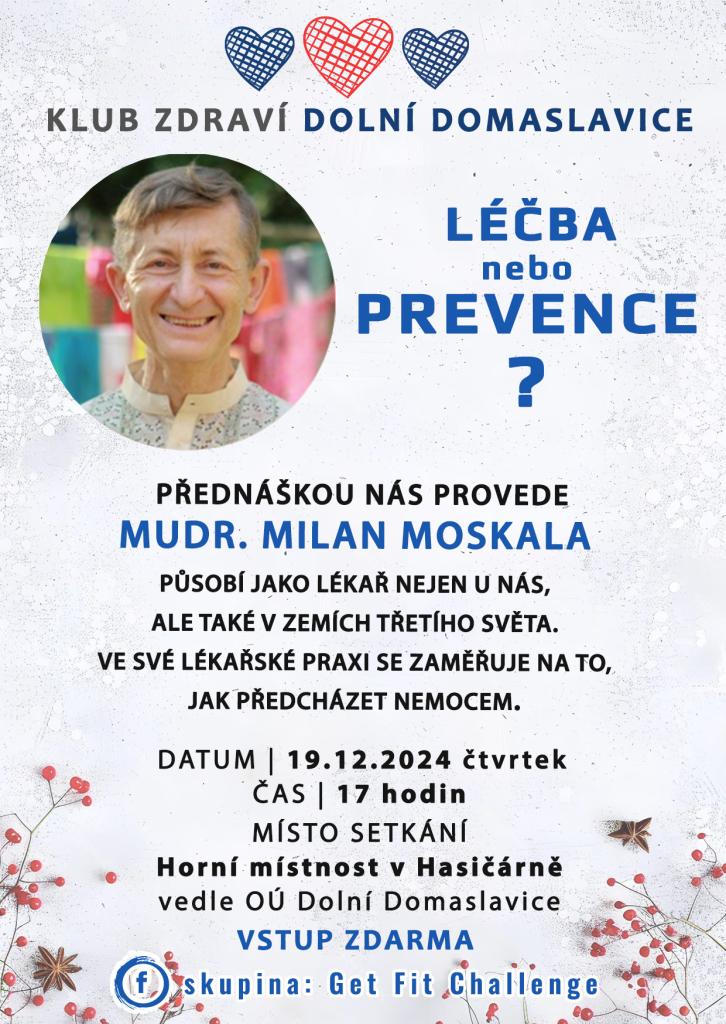 Připojte se k nám na zajímavou přednášku vedenou MUDr. Milanem Moskala, lékařem s bohatými zkušenostmi, který se specializuje na prevenci nemocí. Přednáška se uskuteční 19. prosince 2024 v 17 hodin v Horní místnosti Hasičárny vedle OÚ Dolní Domaslavice. Vstup je zdarma.
