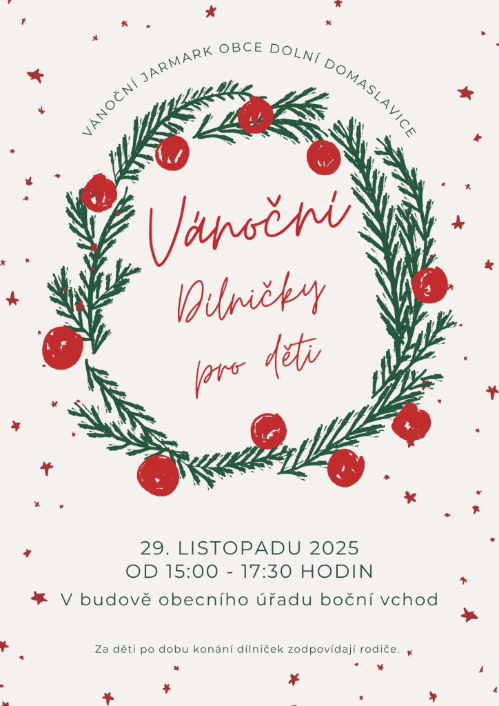 Vánoční jarmark se koná 29. 11. 2025 od 14:00 hodin před obecním úřadem v Dolních Domaslavicích. Těšit se můžete na vystoupení MŠ a ZŠ, Máš a Medvěd. Program zahrnuje také hudební vystoupení ACOUSTRIO a Václava Fajfra, a Mirabel. V rámci akce budou k dispozici vánoční dílničky a tombola.